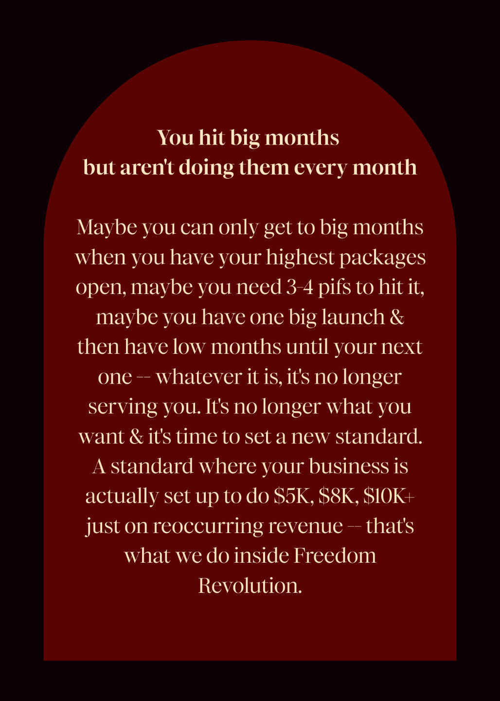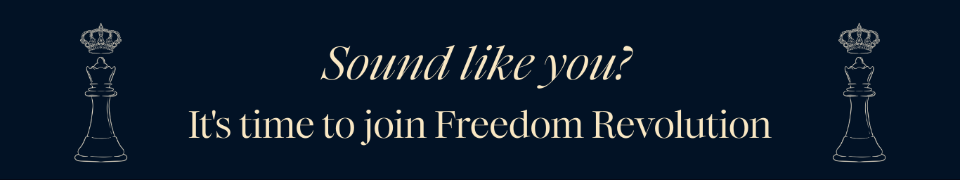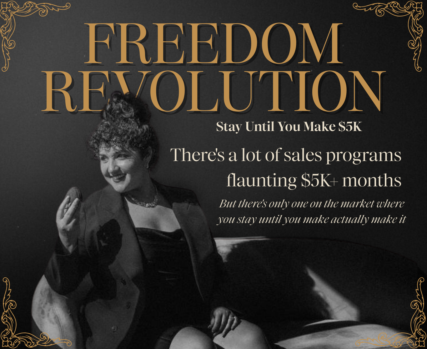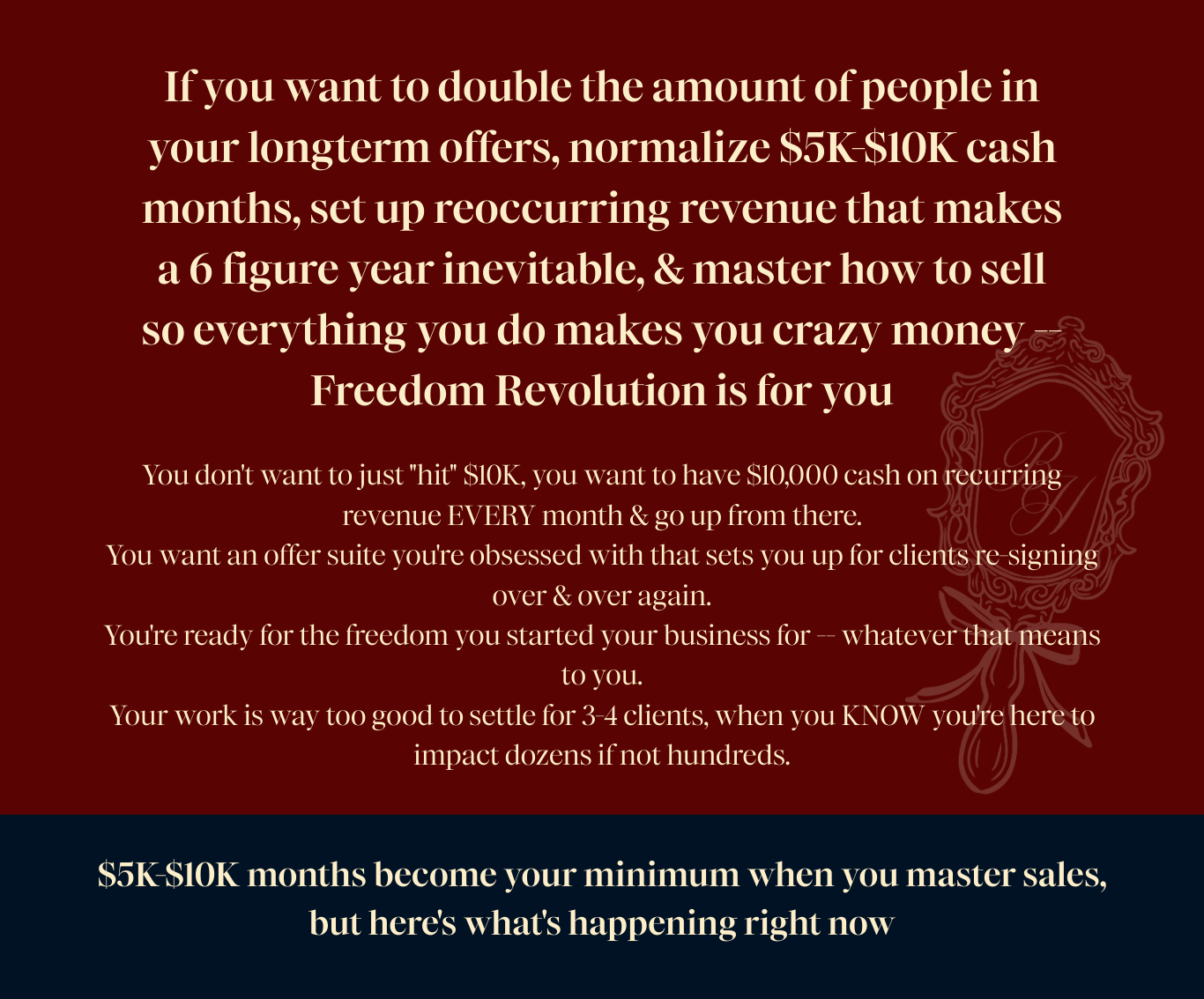Who you are matters. How you sell matters. How you set yourself up strategically to not just hit a high month, but sustain them -- matters. It all matters. So in Freedom Revolution, we do all this work, all in one place. You will master sales when there's nothing in you that's afraid to hold big months. You will master sales when every piece of content you put out calls in clients. You will master sales when you become the leader who people flock to. You will master sales when you unshame yourself for your debt, your lack of savings, your self judgment for how you've behaved with money. You will master sales when you're so confident, nothing shakes you.
