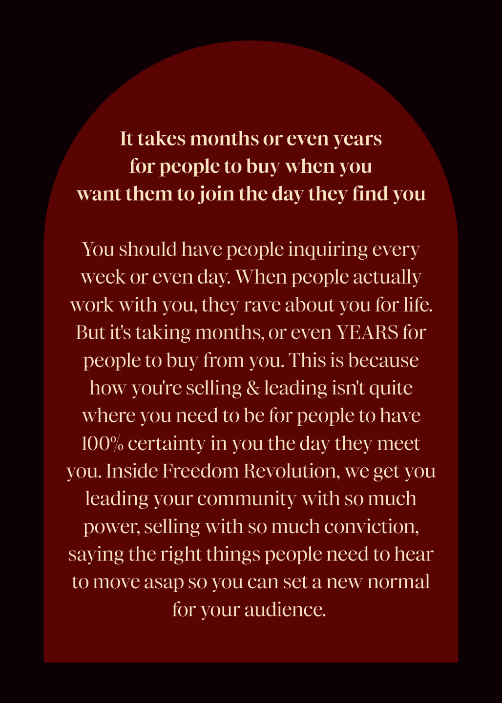 The truth is, your income is barely moving because you’re taking YEARS (and tens of thousands of dollars) to learn the skills you need to create & sustain big months. You spend 6 months working on your identity. Then you join an 8 month messaging mastermind. Then you sign up for 12 months in a money program. It takes 2-3 years to get what you'll get in one single DAY when you join Freedom Revolution.
