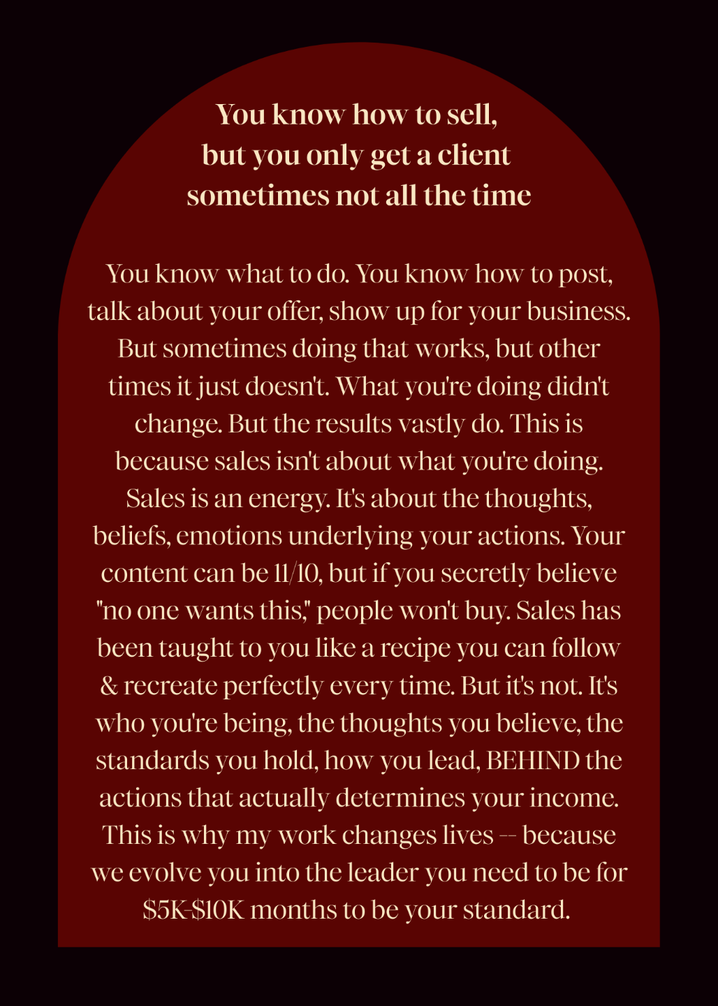 Who you are being is how you get paid. And I can prove it to you -- you're doing the same things as 7 figure industry bombshells. You're posting. You're showing up. You sit on calls with 8 figure coaches & thing "I could've led this call" -- you're just as good. You're doing just as much. So why is there such a gap between your income & hers? SHE has mastered the energy of sales. She's not selling hoping people buy. She's not selling secretly believing she's a bad person for charging this much. There's no resistance within her. No ick. No hesitation. How she sees herself, how she leads her people, how she sells, how she gets paid is all a match for the money she wants to make -- so she makes it. It's really that simple.