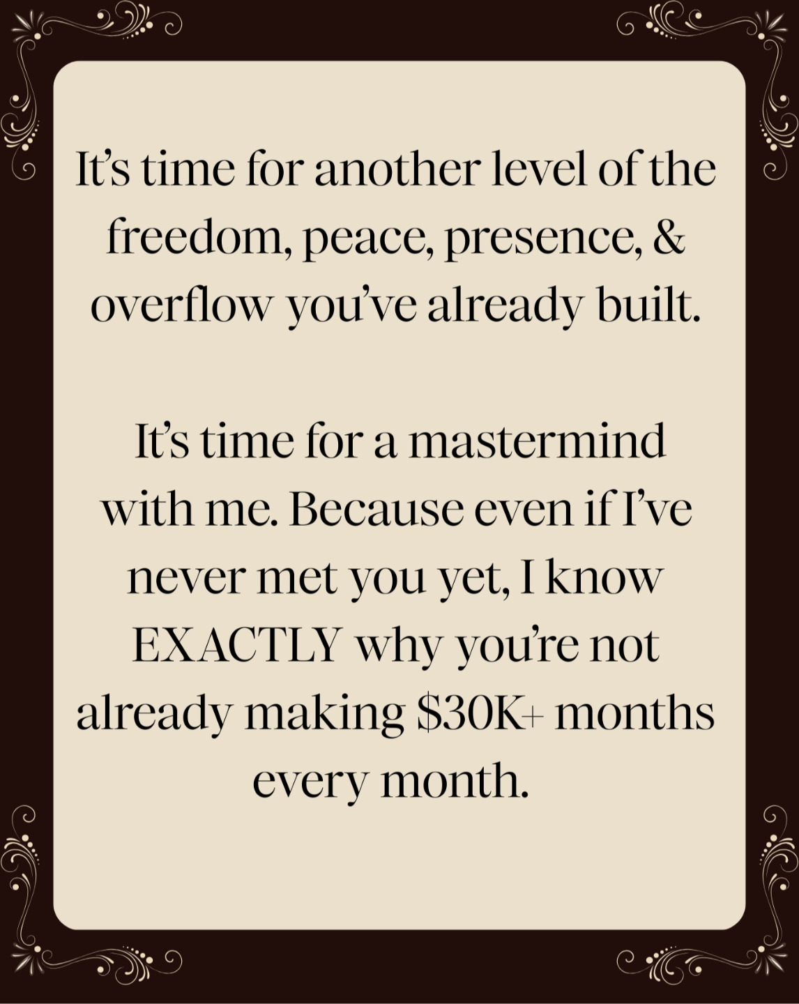 This isn’t a “rah rah you’re a tiger” coaching where you briefly feel better, without ever making real progress. Coming into a mastermind with me is a strategic move for your business where you’re investing to master a skillset that normalizes multi 5 figure months.Â